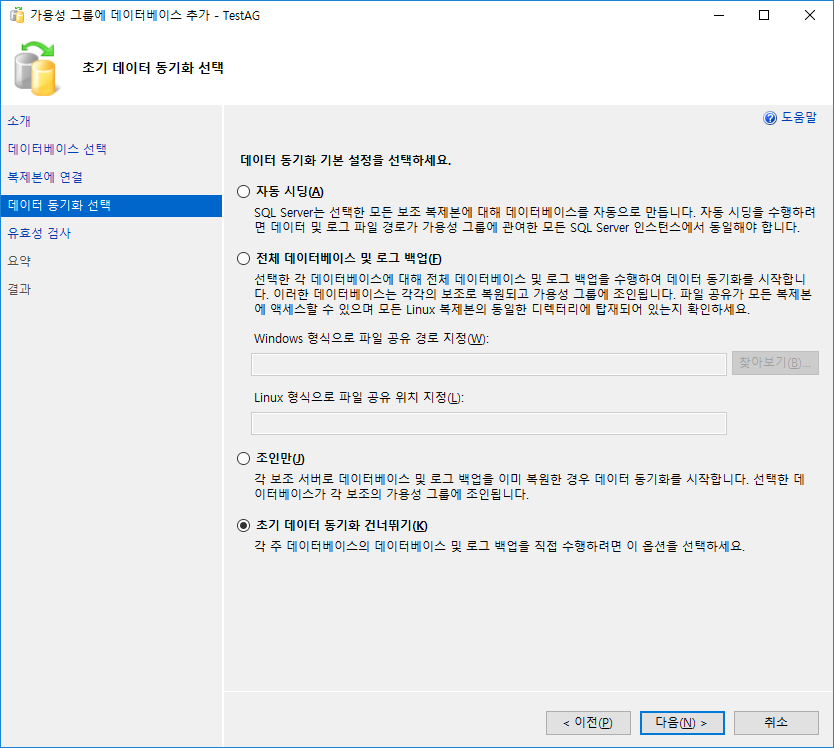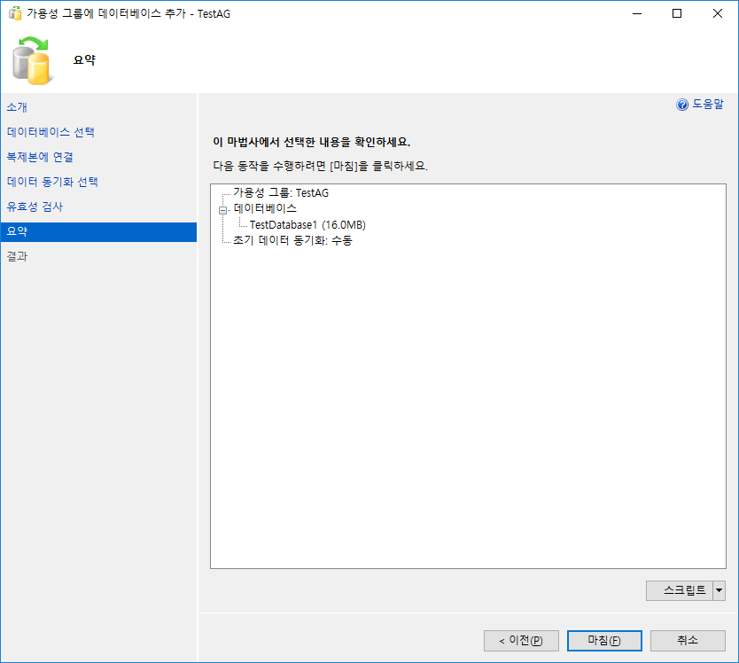 복원 완료후 가용성 그룹에 데이터 베이스 추가를위해 데이터베이스 추가 선택